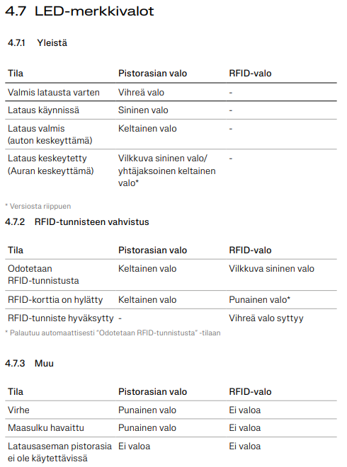 LED-valojen eri värit osoittavat, missä OCPP-tilassa laturi on, Charge Ampsin käyttöoppaissa olevien kuvausten mukaisesti. Katso Aura-laturin linkki täältä.
