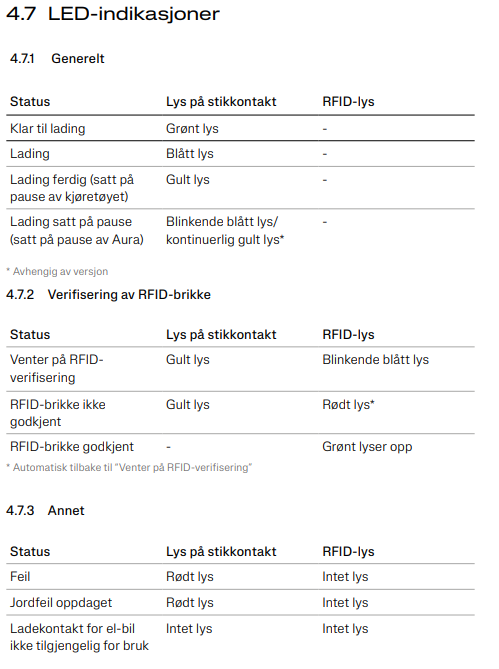 De ulike fargene på LED-lysene viser hvilken OCPP-status laderen befinner seg i, i henhold til beskrivelsene i Charge Amps sine brukermanualer. Se lenken til Aura her.